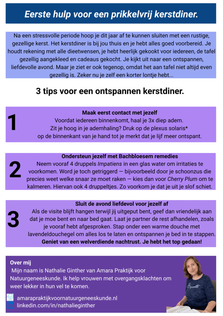 Veel vrouwen in de overgang hebben last van stemmingswisselingen. Zeker als ze het heel druk hebben en moe zijn, hebben ze een korter lontje. Niet leuk voor henzelf, maar ook niet voor de omgeving. Natuurlijk is het handiger om te zorgen, dat je niet overprikkeld raakt, maar het leven gaat natuurlijk gewoon door. Ik maakte dit jaar voor jou een video & PDF met 3 praktische tips om jou een ontspannen kerst toe te wensen.